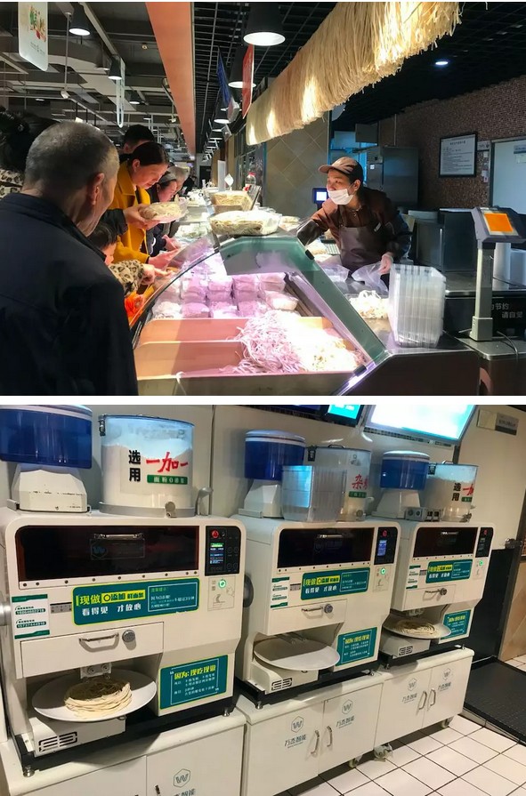 在許昌胖東來生活廣場店入駐了三臺智能鮮面機設備,三臺設備同時運營,尤其到高峰期,買面條的人排起長隊,工作人員一邊服務,一邊還要不停的往機器里添加面粉(三臺設備一天大約消耗十多袋的面粉),場面相當震撼。筆者在現場觀看學習并略感吃驚的時候,有個老大爺在背后小心的提醒說,“您買面條嗎,不買就讓一讓”。由此可見,這現制鮮面條還真是火爆。